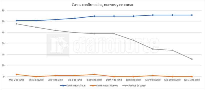 Los cuatro análisis que resultaron positivos ayer, corresponden a personas que ya se habían hecho el test, con resultado positivo de COVID-19, y a quienes se les hizo un nuevo test por seguimiento epidemiológico. Eso explica que, a pesar de haberse registrado nuevos test positivos, no haya casos activos nuevos.
