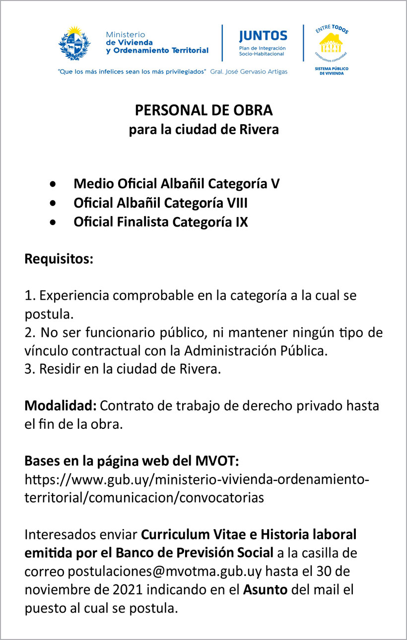 PERSONAL DE OBRA para la ciudad de Rivera